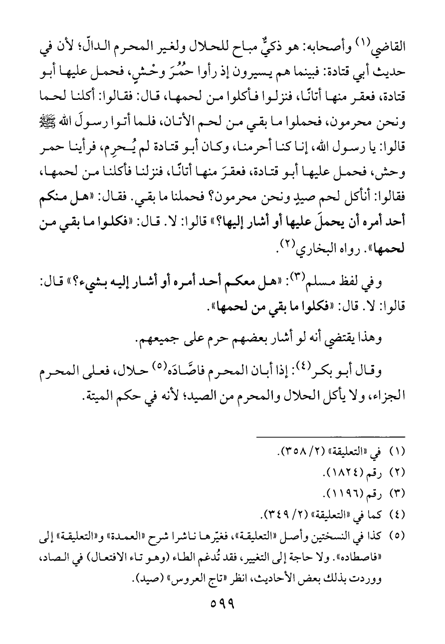 القاضي (¬١) وأصحابه: هو ذكيٌّ مباح للحلال ولغير المحرم الدالّ؛ لأن في حديث أبي قتادة: فبينما هم يسيرون إذ رأوا حُمُرَ وحْشٍ، فحمل عليها أبو قتادة، فعقر منها أتانًا، فنزلوا فأكلوا من لحمها، قال: فقالوا: أكلنا لحما ونحن محرمون، فحملوا ما بقي من لحم الأتان، فلما أتوا رسولَ الله - صلى الله عليه وسلم - قالوا: يا رسول الله، إنا كنا أحرمنا، وكان أبو قتادة لم يُحرِم، فرأينا حمر وحش، فحمل عليها أبو قتادة، فعقرَ منها أتانًا، فنزلنا فأكلنا من لحمها، فقالوا: أنأكل لحم صيدٍ ونحن محرمون؟ فحملنا ما بقي. فقال: «هل منكم أحد أمره أن يحملَ عليها أو أشار إليها؟» قالوا: لا. قال: «فكلوا ما بقي من لحمها». رواه البخاري (¬٢).