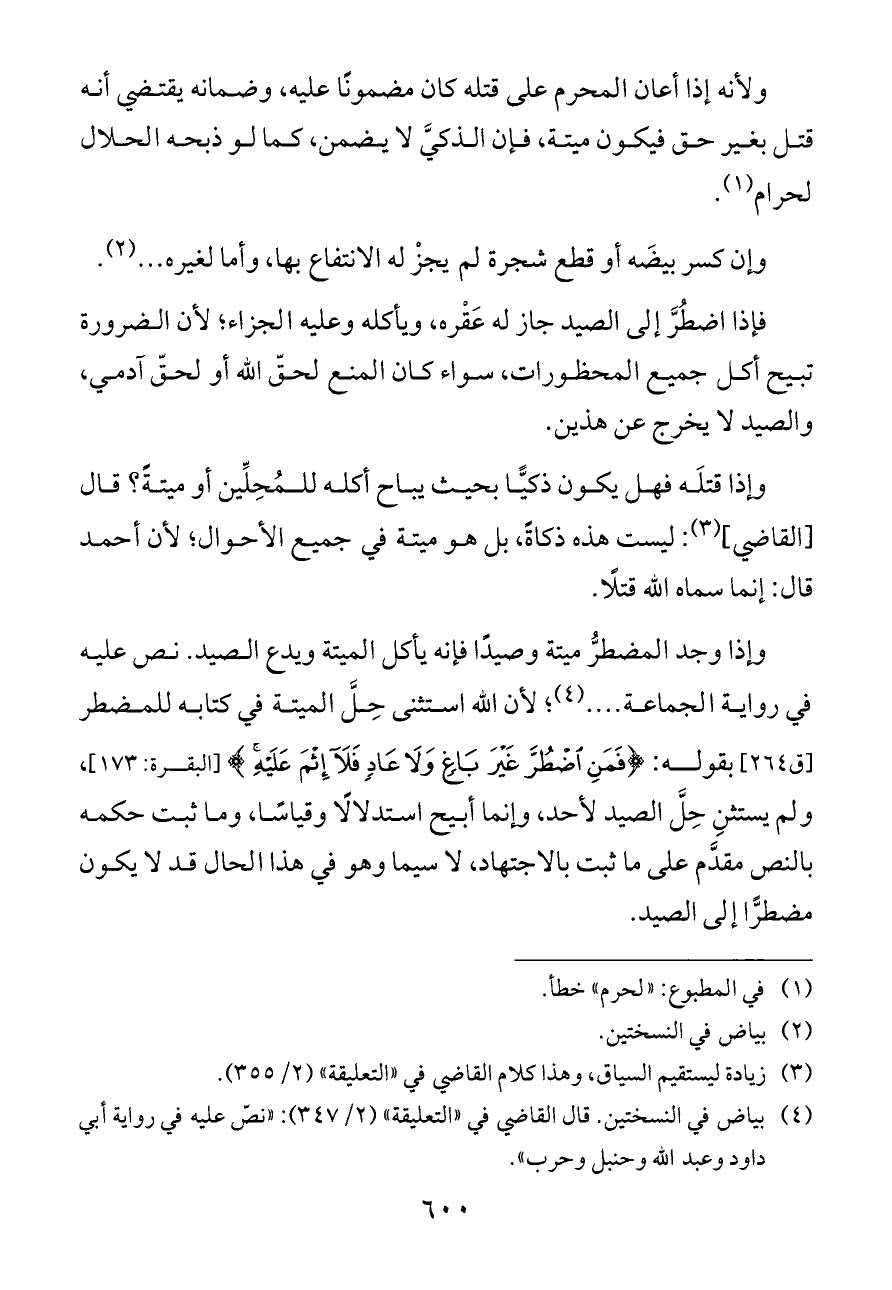وإذا وجد المضطرُّ ميتة وصيدًا فإنه يأكل الميتة ويدع الصيد. نص عليه في رواية الجماعة .... (¬٤)؛ لأن الله استثنى حِلَّ الميتة في كتابه للمضطر [ق ٢٦٤] بقوله: {فَمَنِ اضْطُرَّ غَيْرَ بَاغٍ وَلَا عَادٍ فَلَا إِثْمَ عَلَيْهِ} [البقرة: ١٧٣]، ولم يستثنِ حِلَّ الصيد لأحد، وإنما أبيح استدلالًا وقياسًا، وما ثبت حكمه بالنص مقدَّم على ما ثبت بالاجتهاد، لا سيما وهو في هذا الحال قد لا يكون مضطرًّا إلى الصيد.