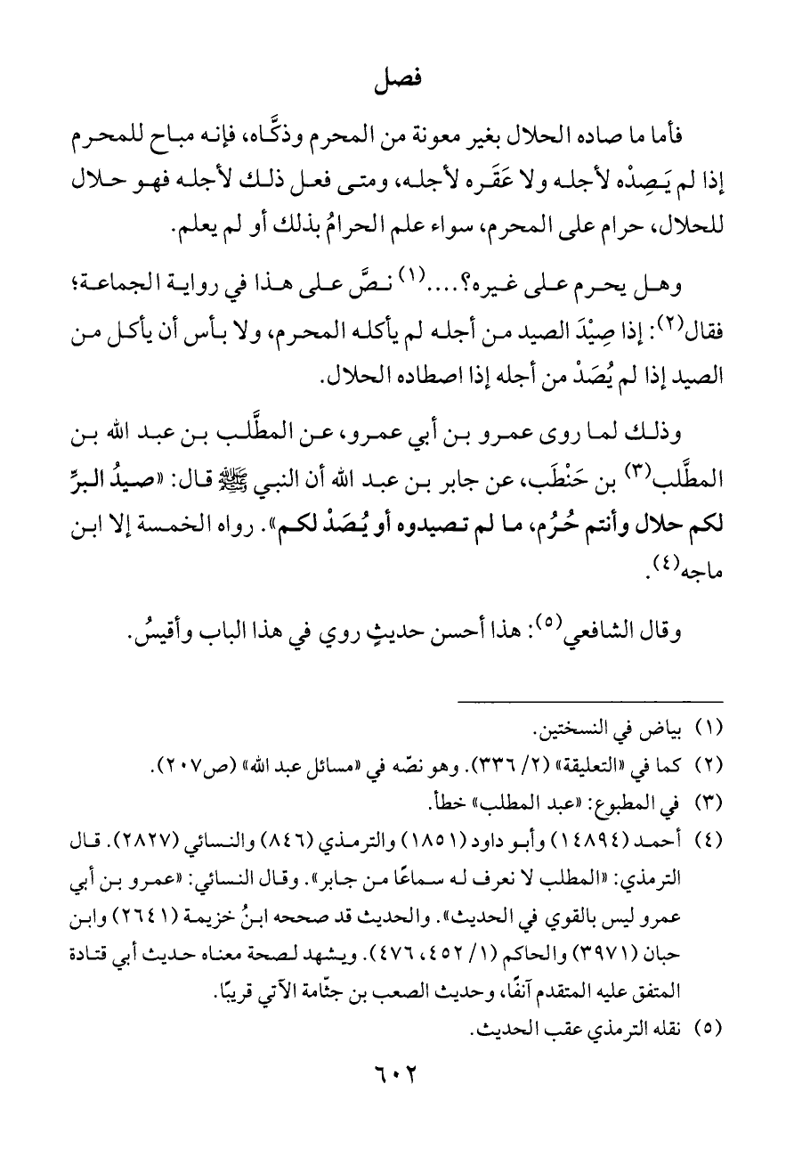 وذلك لما روى عمرو بن أبي عمرو، عن المطَّلب بن عبد الله بن المطَّلب (¬٣) بن حَنْطَب، عن جابر بن عبد الله أن النبي - صلى الله عليه وسلم - قال: «صيدُ البرِّ لكم حلال وأنتم حُرُم، ما لم تصيدوه أو يُصَدْ لكم». رواه الخمسة إلا ابن ماجه (¬٤).