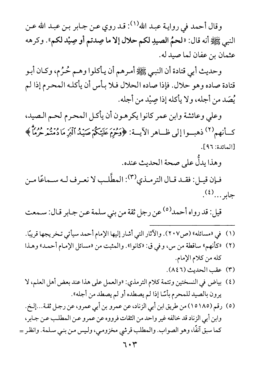 وقال أحمد في رواية عبد الله (¬١): قد روي عن جابر بن عبد الله عن النبي - صلى الله عليه وسلم - أنه قال: «لحمُ الصيدِ لكم حلال إلا ما صِدتم أو صِيْد لكم». وكرهه عثمان بن عفان لما صيد له.