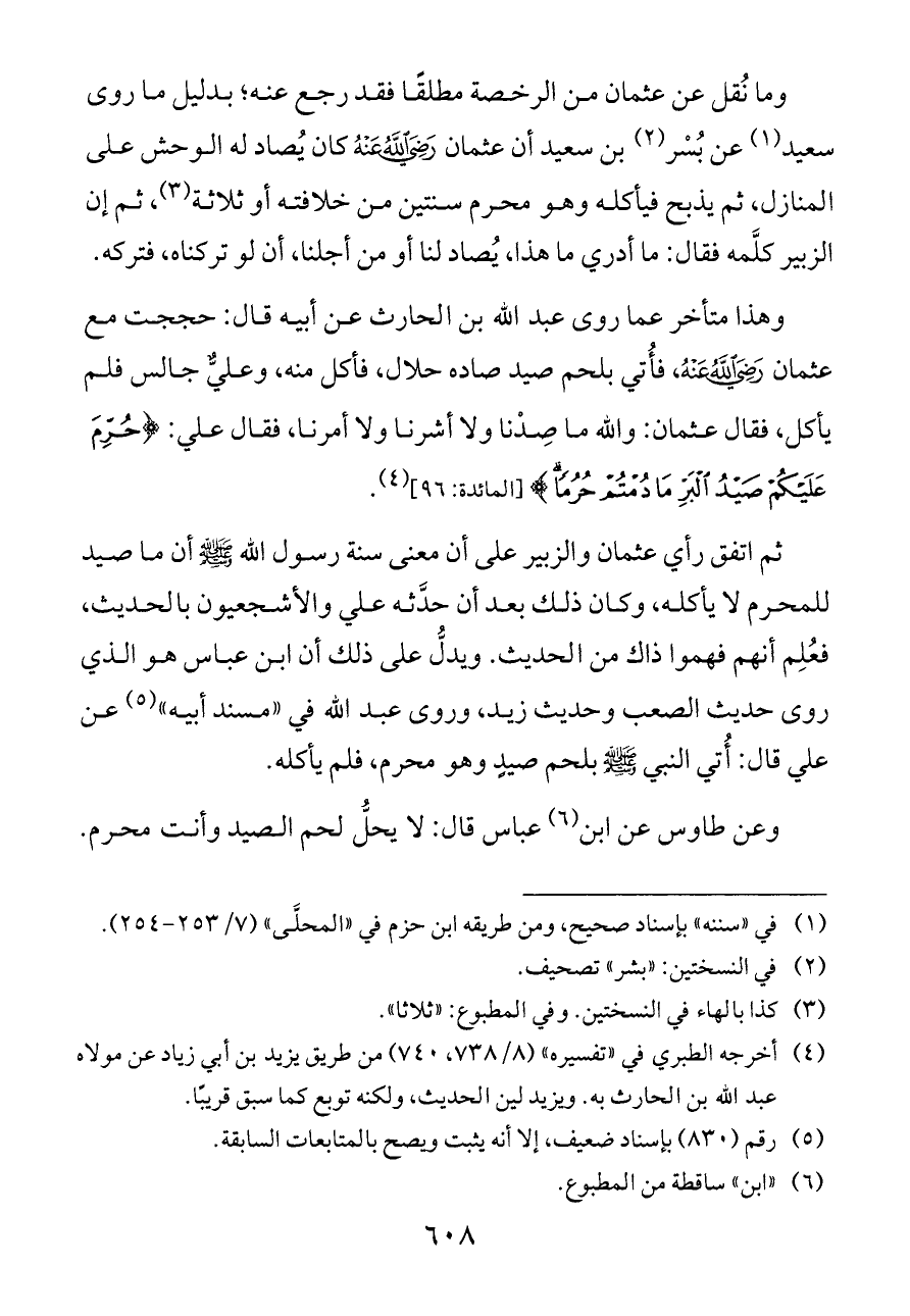 وما نُقل عن عثمان من الرخصة مطلقًا فقد رجع عنه؛ بدليل ما روى سعيد (¬١) عن بُسْر (¬٢) بن سعيد أن عثمان - رضي الله عنه - كان يُصاد له الوحش على المنازل، ثم يذبح فيأكله وهو محرم سنتين من خلافته أو ثلاثة (¬٣)، ثم إن الزبير كلَّمه فقال: ما أدري ما هذا، يُصاد لنا أو من أجلنا، أن لو تركناه، فتركه.