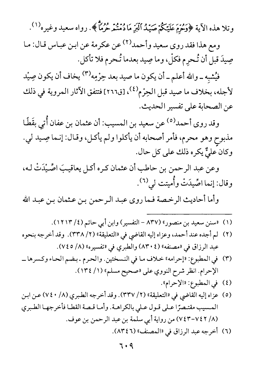 وتلا هذه الآية {وَحُرِّمَ عَلَيْكُمْ صَيْدُ الْبَرِّ مَا دُمْتُمْ حُرُمًا}. رواه سعيد وغيره (¬١).