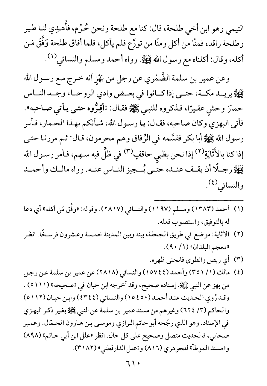 وعن عمير بن سلمة الضَّمْري عن رجل من بَهْزٍ أنه خرج مع رسول الله - صلى الله عليه وسلم - يريد مكة، حتى إذا كانوا في بعض وادي الروحاء وجد الناس حمارَ وحشٍ عقيرًا، فذكروه للنبي - صلى الله عليه وسلم - فقال: «أقِرُّوه حتى يأتي صاحبه». فأتى البهزي وكان صاحبه، فقال: يا رسول الله، شأنكم بهذا الحمار، فأمر رسول الله - صلى الله عليه وسلم - أبا بكر فقسَّمه في الرِّفاق وهم محرمون، قال: ثم مررنا حتى إذا كنا بالأَثَايَةِ (¬٢) إذا نحن بظبيٍ حاقفٍ (¬٣) في ظلٍّ فيه سهم، فأمر رسول الله - صلى الله عليه وسلم - رجلًا أن يقف عنده حتى يُجيز الناس عنه. رواه مالك وأحمد والنسائي (¬٤).
