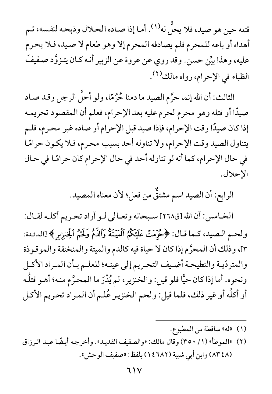 الخامس: أن الله [ق ٢٦٨] سبحانه وتعالى لو أراد تحريم أكله لقال: ولحم الصيد، كما قال: {حُرِّمَتْ عَلَيْكُمُ الْمَيْتَةُ وَالدَّمُ وَلَحْمُ الْخِنْزِيرِ} [المائدة: ٣]، وذلك أن المحرَّم إذا كان لا حياة فيه كالدم والميتة والمنخنقة والموقوذة والمتردّية والنطيحة أضيف التحريم إلى عينه؛ للعلم بأن المراد الأكل ونحوه. أما إذا كان حيًّا فلو قيل: والخنزير، لم يُدْرَ ما المحرَّم منه؛ أهو قتلُه أو أكلُه أو غير ذلك، فلما قيل: ولحم الخنزير عُلم أن المراد تحريم الأكل