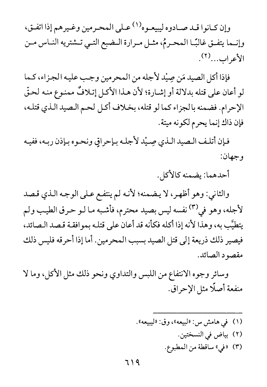 والثاني: وهو أظهر، لا يضمنه؛ لأنه لم ينتفع على الوجه الذي قصد لأجله، وهو في (¬٣) نفسه ليس بصيد محترم، فأشبه ما لو حرق الطيب ولم يتطيَّب به، وهذا لأنه إذا أكله فكأنه قد أعان على قتله بموافقة قصد الصائد، فيصير ذلك ذريعة إلى قتل الصيد بسبب المحرمين. أما إذا أحرقه فليس ذلك مقصود الصائد.