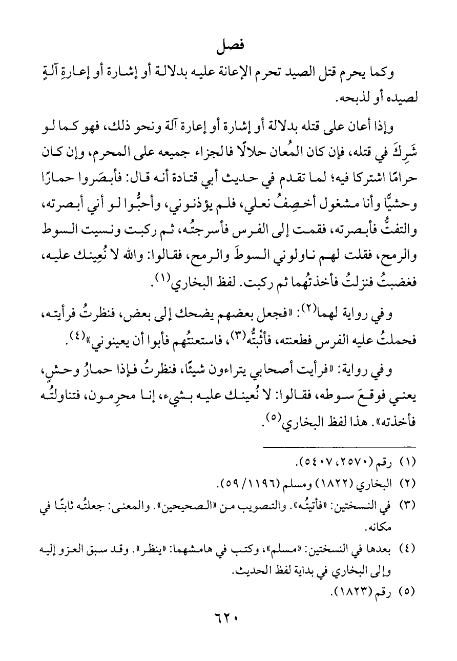 وكما يحرم قتل الصيد تحرم الإعانة عليه بدلالة أو إشارة أو إعارةِ آلةٍ لصيده أو لذبحه.
