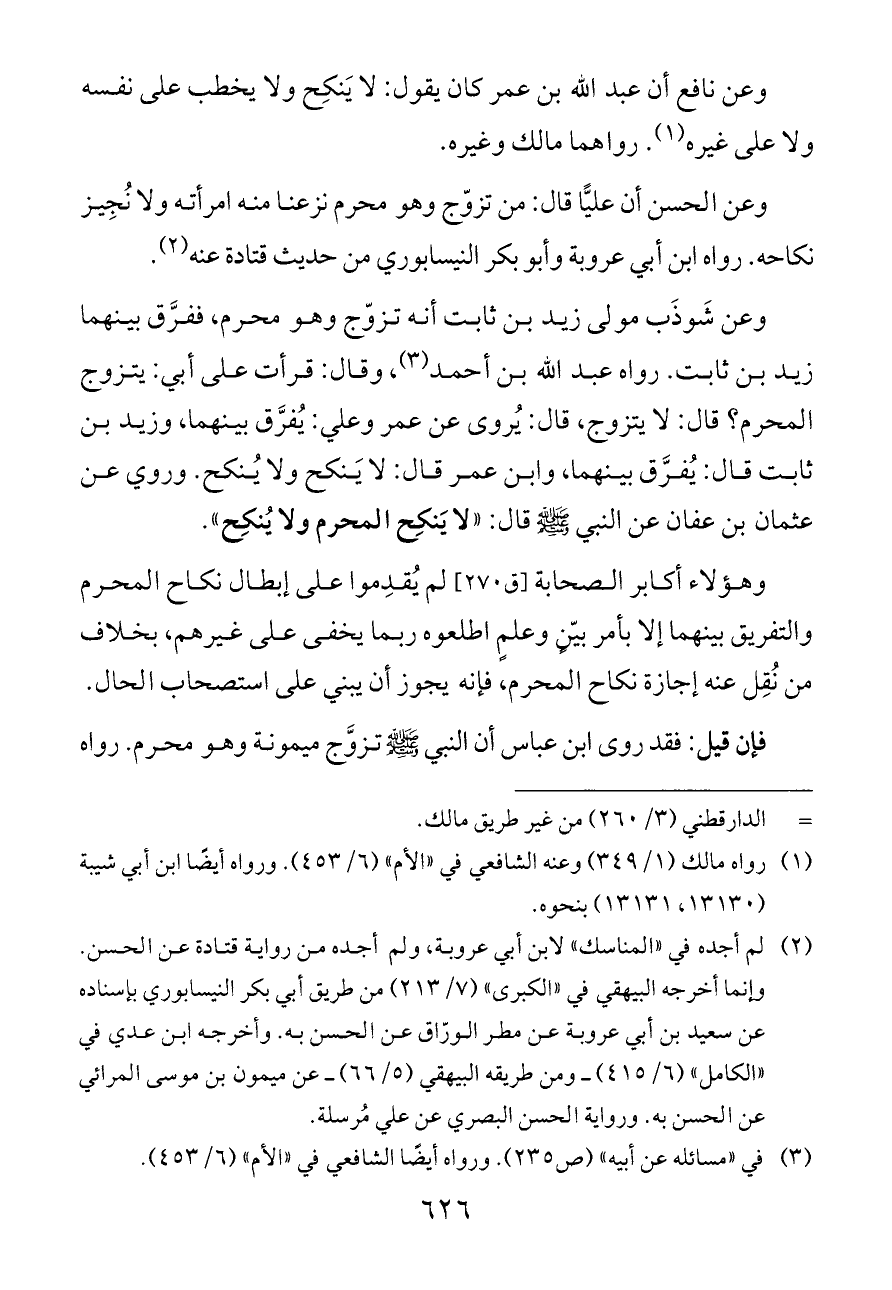 وعن نافع أن عبد الله بن عمر كان يقول: لا يَنكِح ولا يخطب على نفسه ولا على غيره (¬١). رواهما مالك وغيره.