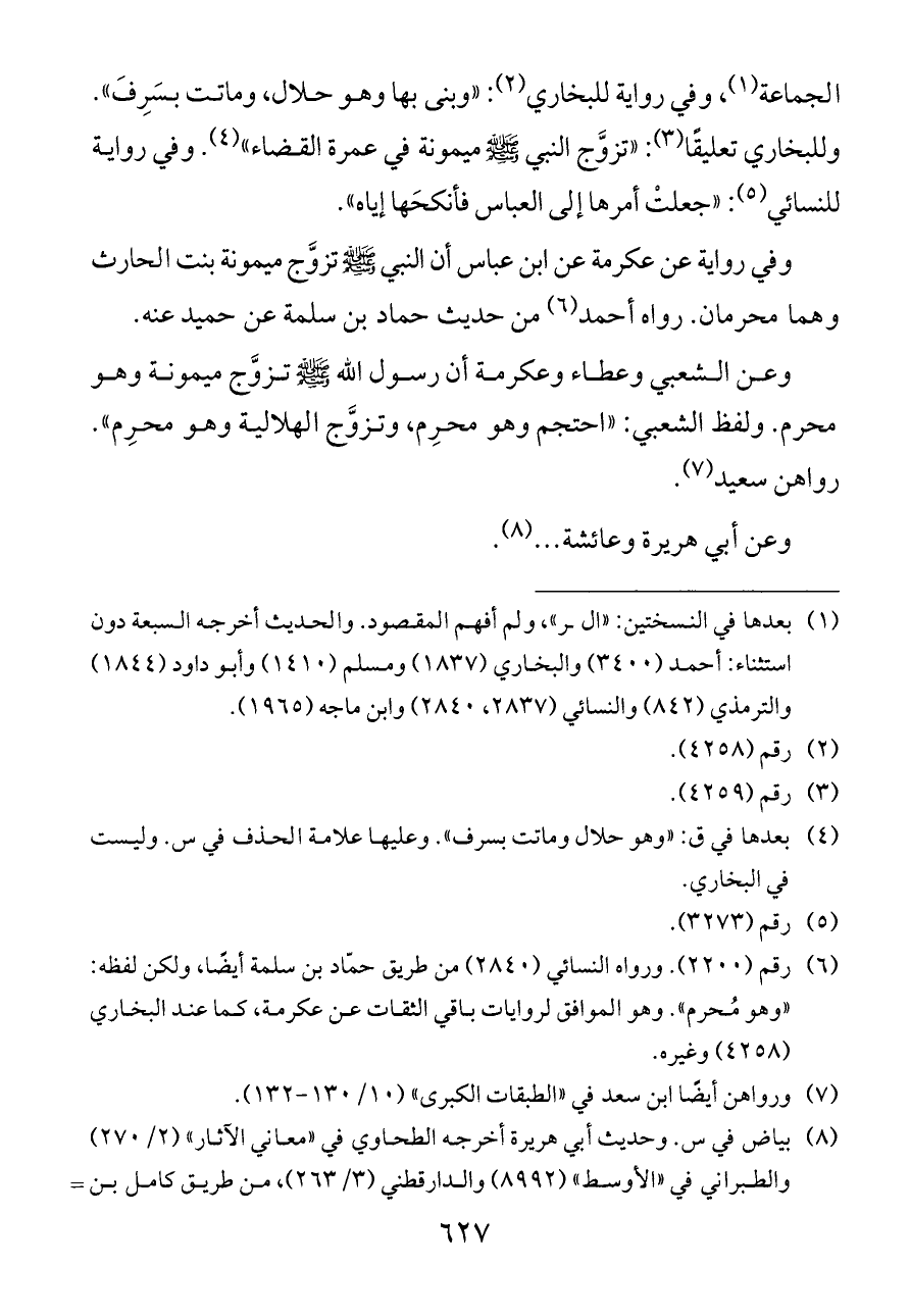 الجماعة (¬١)، وفي رواية للبخاري (¬٢): «وبنى بها وهو حلال، وماتت بسَرِفَ». وللبخاري تعليقًا (¬٣): «تزوَّج النبي - صلى الله عليه وسلم - ميمونة في عمرة القضاء» (¬٤). وفي رواية للنسائي (¬٥): «جعلتْ أمرها إلى العباس فأنكحَها إياه».