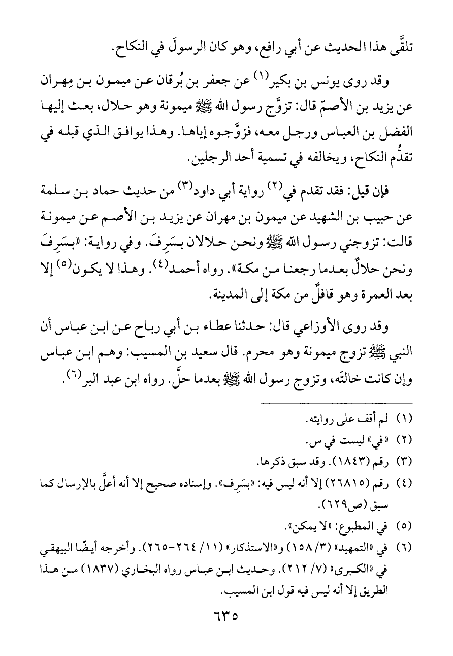 فإن قيل: فقد تقدم في (¬٢) رواية أبي داود (¬٣) من حديث حماد بن سلمة عن حبيب بن الشهيد عن ميمون بن مهران عن يزيد بن الأصم عن ميمونة قالت: تزوجني رسول الله - صلى الله عليه وسلم - ونحن حلالان بسَرِفَ. وفي رواية: «بسَرِفَ ونحن حلالٌ بعدما رجعنا من مكة». رواه أحمد (¬٤). وهذا لا يكون (¬٥) إلا بعد العمرة وهو قافلٌ من مكة إلى المدينة.