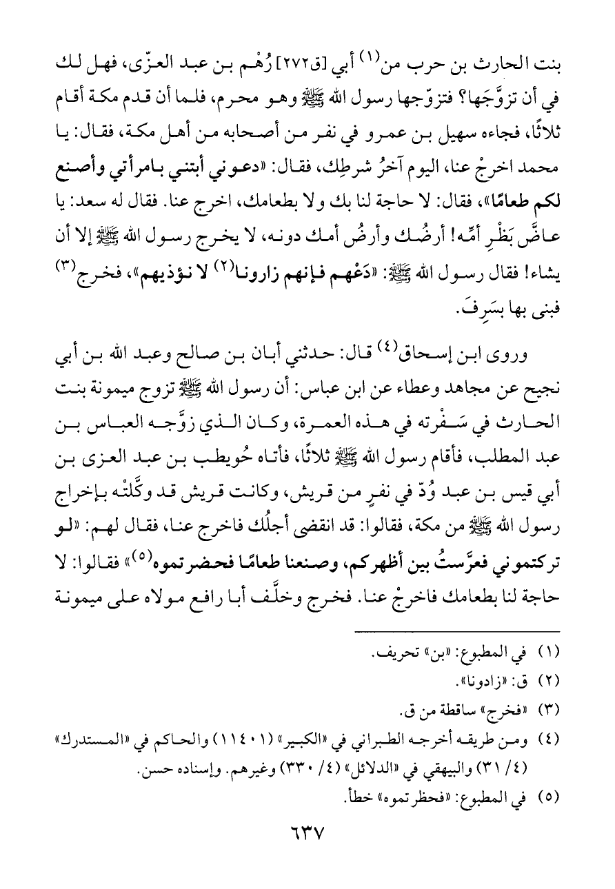 بنت الحارث بن حرب من (¬١) أبي [ق ٢٧٢] رُهْم بن عبد العزّى، فهل لك في أن تزوَّجَها؟ فتزوّجها رسول الله - صلى الله عليه وسلم - وهو محرم، فلما أن قدم مكة أقام ثلاثًا، فجاءه سهيل بن عمرو في نفر من أصحابه من أهل مكة، فقال: يا محمد اخرجْ عنا، اليوم آخرُ شرطِك، فقال: «دعوني أبتني بامرأتي وأصنع لكم طعامًا»، فقال: لا حاجة لنا بك ولا بطعامك، اخرج عنا. فقال له سعد: يا عاضَّ بَظْرِ أمِّه! أرضُك وأرضُ أمك دونه، لا يخرج رسول الله - صلى الله عليه وسلم - إلا أن يشاء! فقال رسول الله - صلى الله عليه وسلم -: «دَعْهم فإنهم زارونا (¬٢) لا نؤذيهم»، فخرج (¬٣) فبنى بها بسَرِفَ.