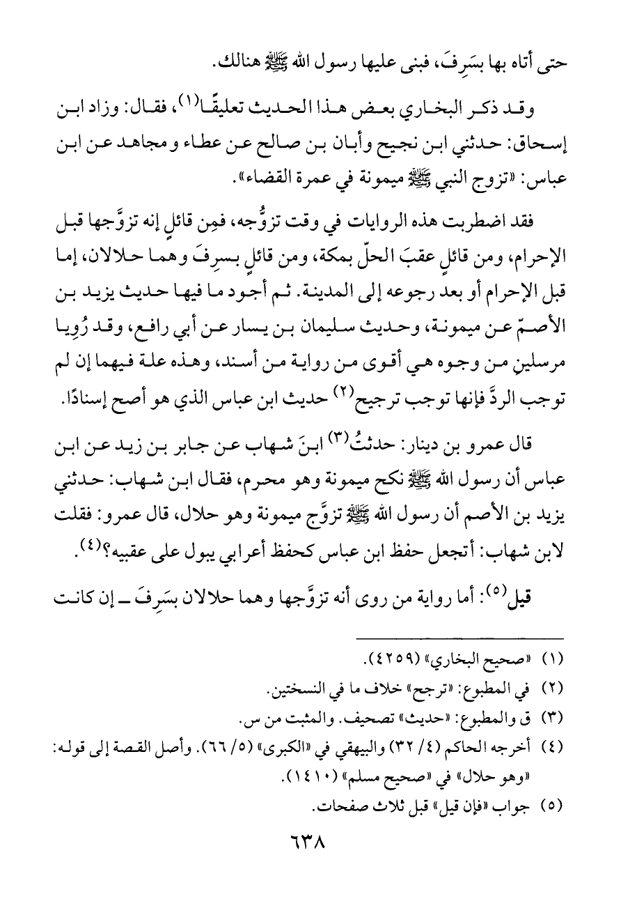 فقد اضطربت هذه الروايات في وقت تزوُّجه، فمِن قائلٍ إنه تزوَّجها قبل الإحرام، ومن قائلٍ عقبَ الحلّ بمكة، ومن قائلٍ بسرِفَ وهما حلالان، إما قبل الإحرام أو بعد رجوعه إلى المدينة. ثم أجود ما فيها حديث يزيد بن الأصمّ عن ميمونة، وحديث سليمان بن يسار عن أبي رافع، وقد رُوِيا مرسلينِ من وجوه هي أقوى من رواية من أسند، وهذه علة فيهما إن لم توجب الردَّ فإنها توجب ترجيح (¬٢) حديث ابن عباس الذي هو أصح إسنادًا.