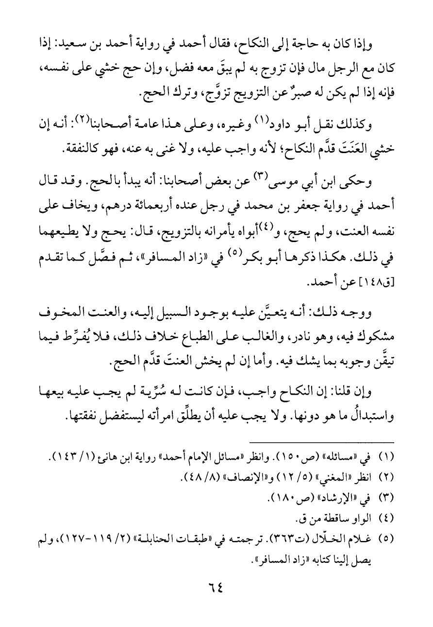 وإذا كان به حاجة إلى النكاح، فقال أحمد في رواية أحمد بن سعيد: إذا كان مع الرجل مال فإن تزوج به لم يبقَ معه فضل، وإن حج خشي على نفسه، فإنه إذا لم يكن له صبرٌ عن التزويج تزوَّج، وترك الحج.