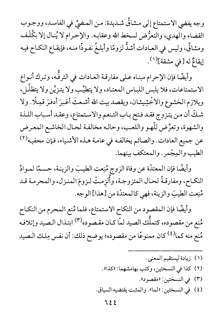 وأيضًا فإن الإحرام مبناه على مفارقة العادات في الترفُّه، وترك أنواع الاستمتاعات، فلا يلبس اللباس المعتاد، ولا يتطيَّب ولا يتزيَّن ولا يتظلَّل، ويلازم الخشوع والاخْشِيشان، ويقصد بيت الله أشعثَ أغبرَ أدفرَ قمِلًا. ولا شكّ أن من يتزوج فقد فتح باب التنعم والاستمتاع، وعقد أسباب اللذة والشهوة، وتعرَّض للّهو واللعب، وحاله مخالفة لحال الخاشع المعرض عن جميع العادات. والصائم يخالفه في عامة هذه الأشياء، فإن محفيه (¬٢) الطيب والمِجْمر. والمعتكف بينهما.