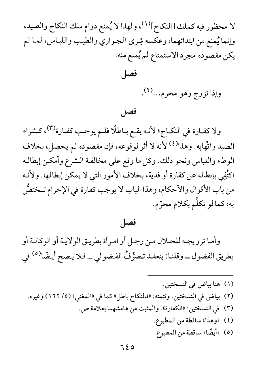 ولا كفارة في النكاح؛ لأنه يقع باطلًا فلم يوجب كفارة (¬٣)، كشراء الصيد واتِّهابه. وهذا (¬٤) لأنه لا أثر لوقوعه، فإن مقصوده لم يحصل، بخلاف الوطء واللباس ونحو ذلك. وكل ما وقع على مخالفة الشرع وأمكن إبطاله اكتُفِي بإبطاله عن كفارة أو فدية، بخلاف الأمور التي لا يمكن إبطالها. ولأنه من باب الأقوال والأحكام، وهذا الباب لا يوجب كفارة في الإحرام تختصُّ به، كما لو تكلَّم بكلام محرّم.