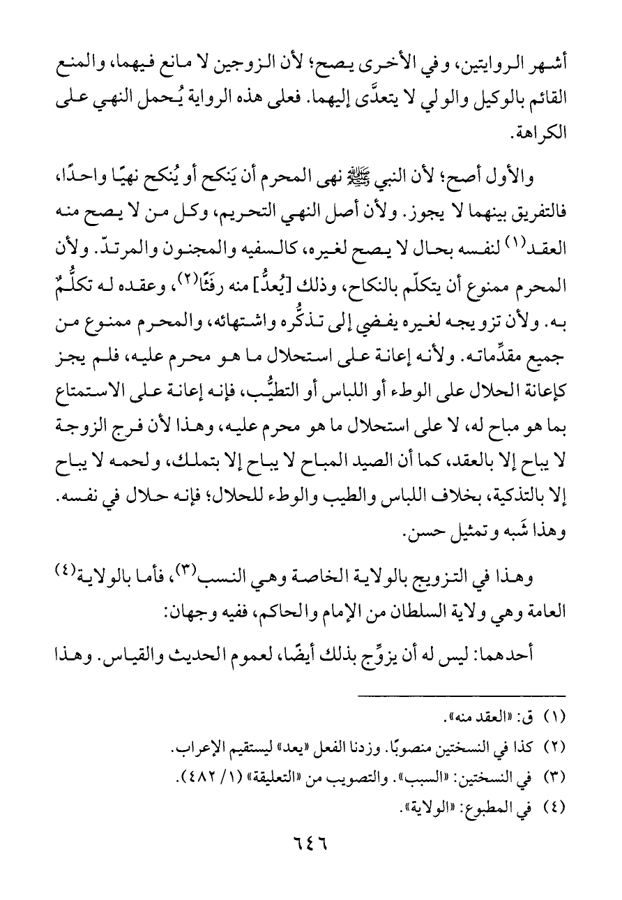 والأول أصح؛ لأن النبي - صلى الله عليه وسلم - نهى المحرم أن يَنكح أو يُنكح نهيًا واحدًا، فالتفريق بينهما لا يجوز. ولأن أصل النهي التحريم، وكل من لا يصح منه العقد (¬١) لنفسه بحال لا يصح لغيره، كالسفيه والمجنون والمرتدّ. ولأن المحرم ممنوع أن يتكلّم بالنكاح، وذلك [يُعدُّ] منه رفَثًا (¬٢)، وعقده له تكلُّمٌ به. ولأن تزويجه لغيره يفضي إلى تذكُّره واشتهائه، والمحرم ممنوع من جميع مقدِّماته. ولأنه إعانة على استحلال ما هو محرم عليه، فلم يجز كإعانة الحلال على الوطء أو اللباس أو التطيُّب، فإنه إعانة على الاستمتاع بما هو مباح له، لا على استحلال ما هو محرم عليه، وهذا لأن فرج الزوجة لا يباح إلا بالعقد، كما أن الصيد المباح لا يباح إلا بتملك، ولحمه لا يباح إلا بالتذكية، بخلاف اللباس والطيب والوطء للحلال؛ فإنه حلال في نفسه. وهذا شَبه وتمثيل حسن.