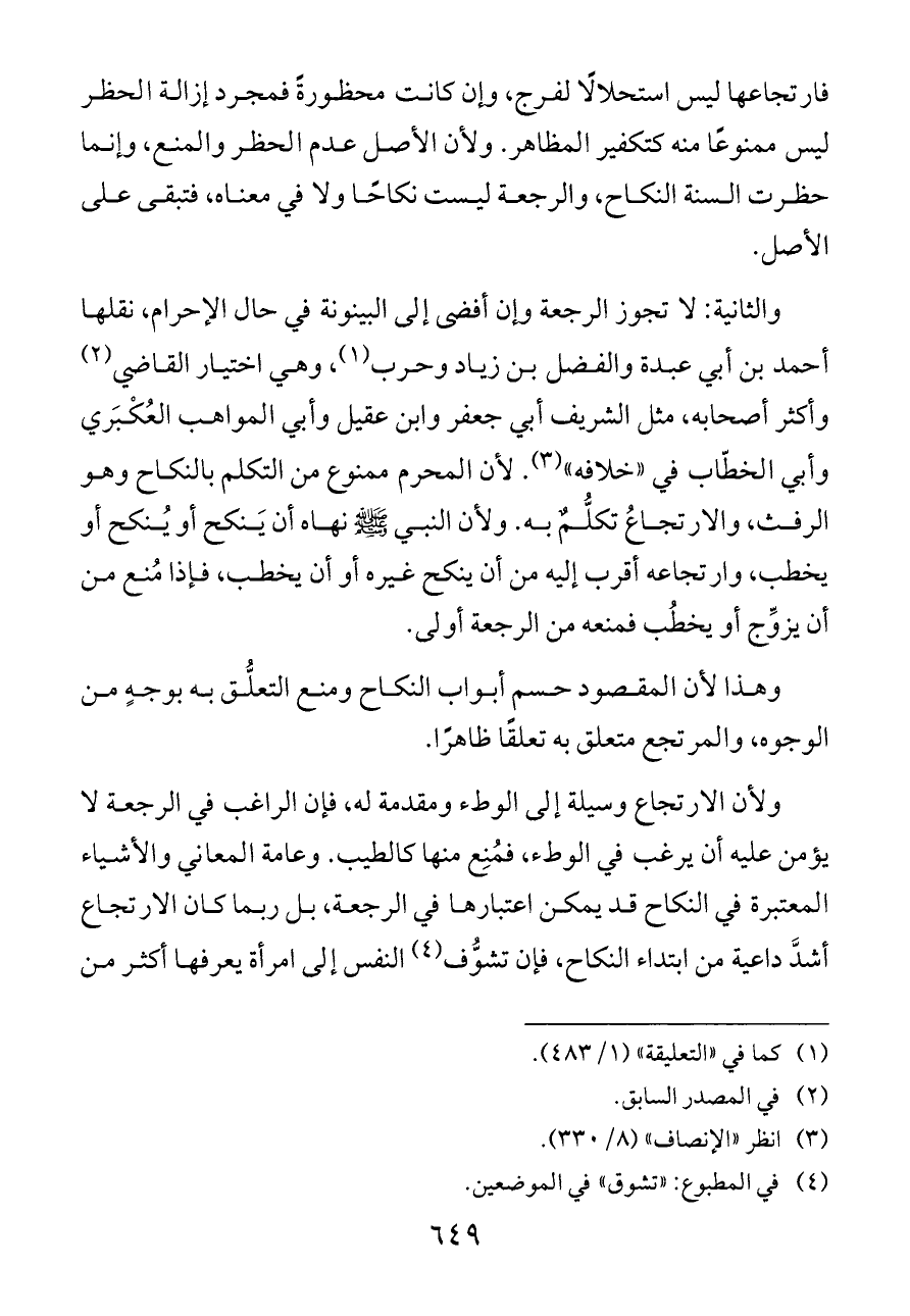 والثانية: لا تجوز الرجعة وإن أفضى إلى البينونة في حال الإحرام، نقلها أحمد بن أبي عبدة والفضل بن زياد وحرب (¬١)، وهي اختيار القاضي (¬٢) وأكثر أصحابه، مثل الشريف أبي جعفر وابن عقيل وأبي المواهب العُكْبَري وأبي الخطّاب في «خلافه» (¬٣). لأن المحرم ممنوع من التكلم بالنكاح وهو الرفث، والارتجاعُ تكلُّمٌ به. ولأن النبي - صلى الله عليه وسلم - نهاه أن يَنكح أو يُنكح أو يخطب، وارتجاعه أقرب إليه من أن ينكح غيره أو أن يخطب، فإذا مُنع من أن يزوِّج أو يخطُب فمنعه من الرجعة أولى.