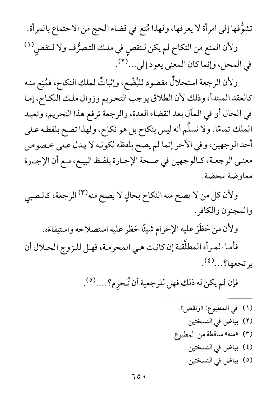 ولأن الرجعة استحلالٌ مقصود للبُضْع، وإثباتٌ لملك النكاح، فمُنِع منه كالعقد المبتدأ، وذلك لأن الطلاق يوجب التحريم وزوال ملك النكاح، إما في الحال أو في المآل بعد انقضاء العدة، والرجعة ترفع هذا التحريم، وتعيد الملك تمامًا. ولا نسلِّم أنه ليس بنكاح بل هو نكاح، ولهذا تصح بلفظه على أحد الوجهين، وفي الآخر إنما لم يصح بلفظه لكونه لا يدل على خصوص معنى الرجعة، كالوجهين في صحة الإجارة بلفظ البيع، مع أن الإجارة معاوضة محضة.