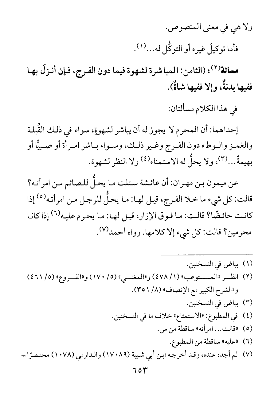 إحداهما: أن المحرم لا يجوز له أن يباشر لشهوةٍ، سواء في ذلك القُبلة والغمز والوطء دون الفرج وغير ذلك، وسواء باشر امرأة أو صبيًّا أو بهيمةً ... (¬٣)، ولا يحلُّ له الاستمناء (¬٤) ولا النظر لشهوة.