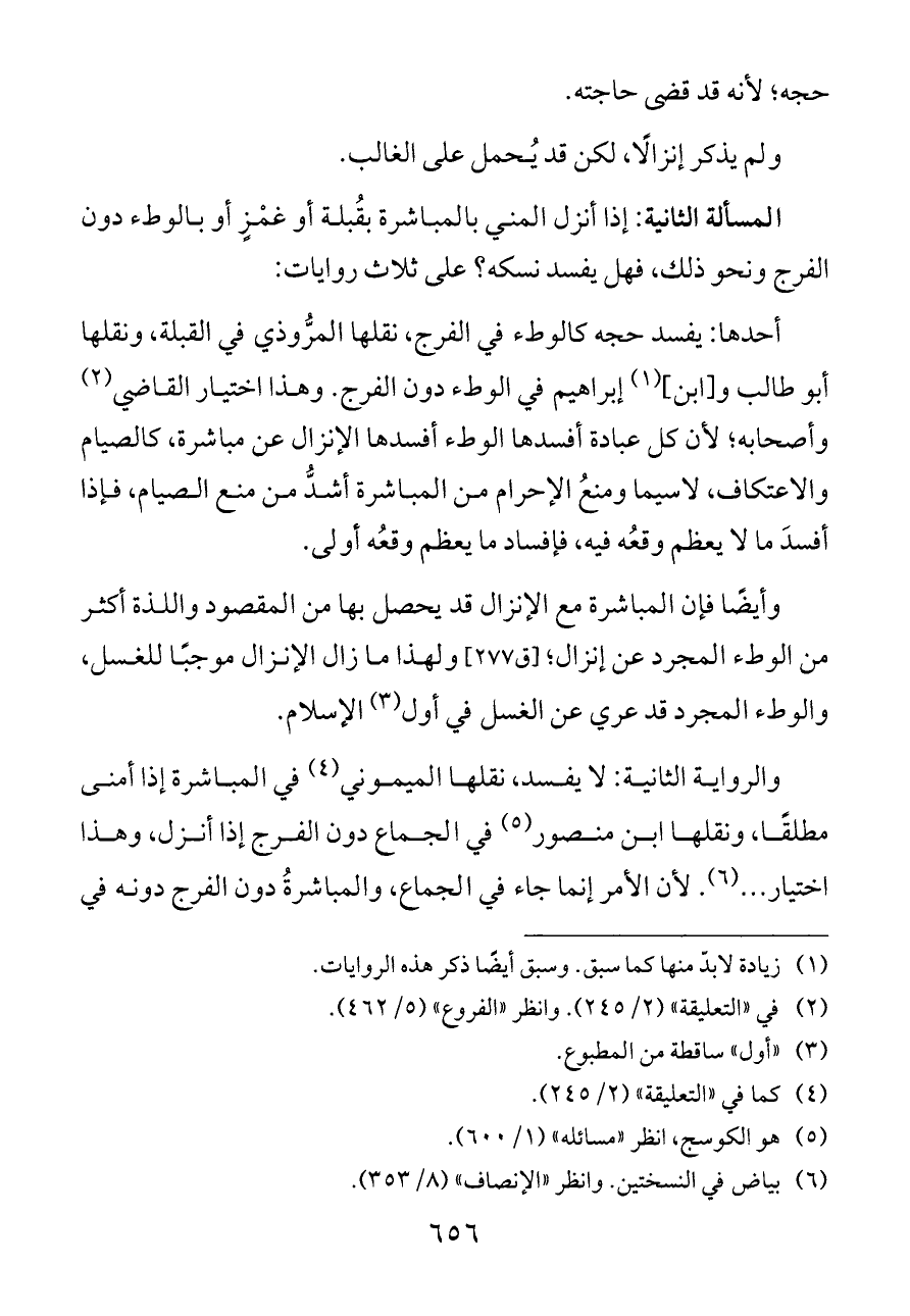 المسألة الثانية: إذا أنزل المني بالمباشرة بقُبلة أو غمْزٍ أو بالوطء دون الفرج ونحو ذلك، فهل يفسد نسكه؟ على ثلاث روايات: