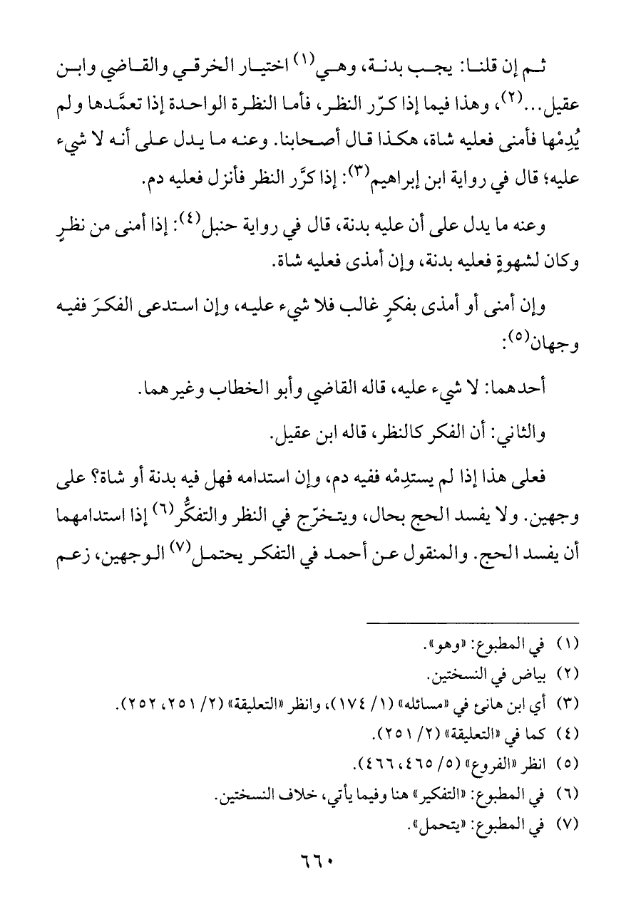 ثم إن قلنا: يجب بدنة، وهي (¬١) اختيار الخرقي والقاضي وابن عقيل ... (¬٢)، وهذا فيما إذا كرّر النظر، فأما النظرة الواحدة إذا تعمَّدها ولم يُدِمْها فأمنى فعليه شاة، هكذا قال أصحابنا. وعنه ما يدل على أنه لا شيء عليه؛ قال في رواية ابن إبراهيم (¬٣): إذا كرَّر النظر فأنزل فعليه دم.