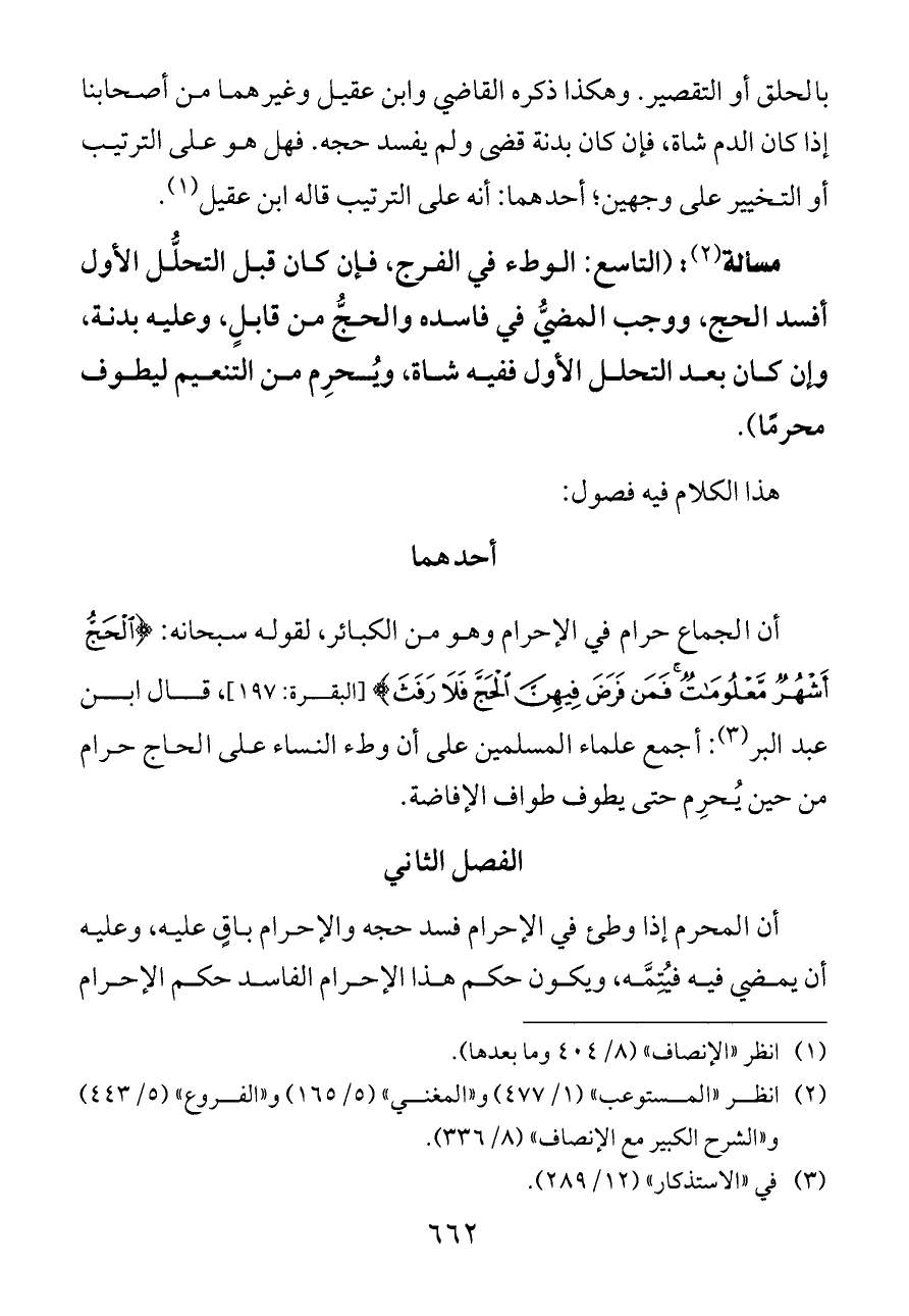 أن الجماع حرام في الإحرام وهو من الكبائر، لقوله سبحانه: {الْحَجُّ أَشْهُرٌ مَعْلُومَاتٌ فَمَنْ فَرَضَ فِيهِنَّ الْحَجَّ فَلَا رَفَثَ} [البقرة: ١٩٧]، قال ابن عبد البر (¬٣): أجمع علماء المسلمين على أن وطء النساء على الحاج حرام من حين يُحرِم حتى يطوف طواف الإفاضة.