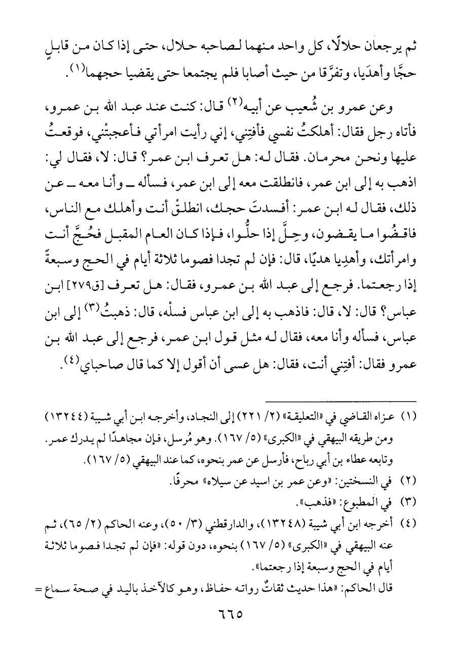 وعن عمرو بن شُعيب عن أبيه (¬٢) قال: كنت عند عبد الله بن عمرو، فأتاه رجل فقال: أهلكتُ نفسي فأفتِني، إني رأيت امرأتي فأعجبتْني، فوقعتُ عليها ونحن محرمان. فقال له: هل تعرف ابن عمر؟ قال: لا، فقال لي: اذهب به إلى ابن عمر، فانطلقت معه إلى ابن عمر، فسأله ــ وأنا معه ــ عن ذلك، فقال له ابن عمر: أفسدتَ حجك، انطلقْ أنت وأهلك مع الناس، فاقضُوا ما يقضون، وحِلَّ إذا حلُّوا، فإذا كان العام المقبل فحُجَّ أنت وامرأتك، وأهدِيا هديًا، قال: فإن لم تجدا فصوما ثلاثة أيام في الحج وسبعةً إذا رجعتما. فرجع إلى عبد الله بن عمرو، فقال: هل تعرف [ق ٢٧٩] ابن عباس؟ قال: لا، قال: فاذهب به إلى ابن عباس فسلْه، قال: ذهبتُ (¬٣) إلى ابن عباس، فسأله وأنا معه، فقال له مثل قول ابن عمر، فرجع إلى عبد الله بن عمرو فقال: أفتِني أنت، فقال: هل عسى أن أقول إلا كما قال صاحباي (¬٤).
