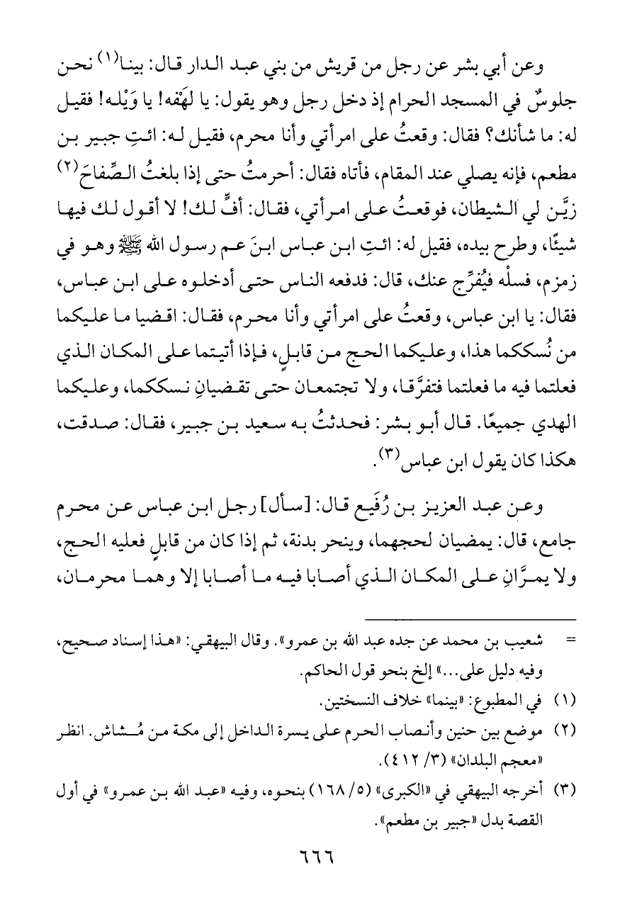 وعن أبي بشر عن رجل من قريش من بني عبد الدار قال: بينا (¬١) نحن جلوسٌ في المسجد الحرام إذ دخل رجل وهو يقول: يا لَهْفه! يا وَيْله! فقيل له: ما شأنك؟ فقال: وقعتُ على امرأتي وأنا محرم، فقيل له: ائتِ جبير بن مطعم، فإنه يصلي عند المقام، فأتاه فقال: أحرمتُ حتى إذا بلغتُ الصِّفاحَ (¬٢) زيَّن لي الشيطان، فوقعتُ على امرأتي، فقال: أفٍّ لك! لا أقول لك فيها شيئًا، وطرح بيده، فقيل له: ائتِ ابن عباس ابنَ عم رسول الله - صلى الله عليه وسلم - وهو في زمزم، فسلْه فيُفرِّج عنك، قال: فدفعه الناس حتى أدخلوه على ابن عباس، فقال: يا ابن عباس، وقعتُ على امرأتي وأنا محرم، فقال: اقضيا ما عليكما من نُسككما هذا، وعليكما الحج من قابلٍ، فإذا أتيتما على المكان الذي فعلتما فيه ما فعلتما فتفرَّقا، ولا تجتمعان حتى تقضيانِ نسككما، وعليكما الهدي جميعًا. قال أبو بشر: فحدثتُ به سعيد بن جبير، فقال: صدقت، هكذا كان يقول ابن عباس (¬٣).