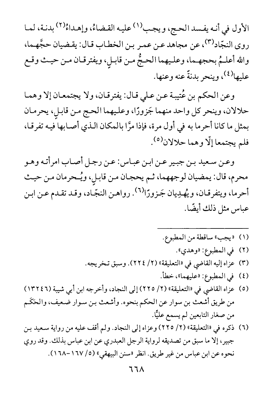 وعن سعيد بن جبير عن ابن عباس: عن رجل أصاب امرأته وهو محرم، قال: يمضيان لوجههما، ثم يحجان من قابلٍ، ويُحرمان من حيث أحرما، ويتفرقان، ويُهدِيان جَزورًا (¬٦). رواهن النجّاد، وقد تقدم عن ابن عباس مثل ذلك أيضًا.