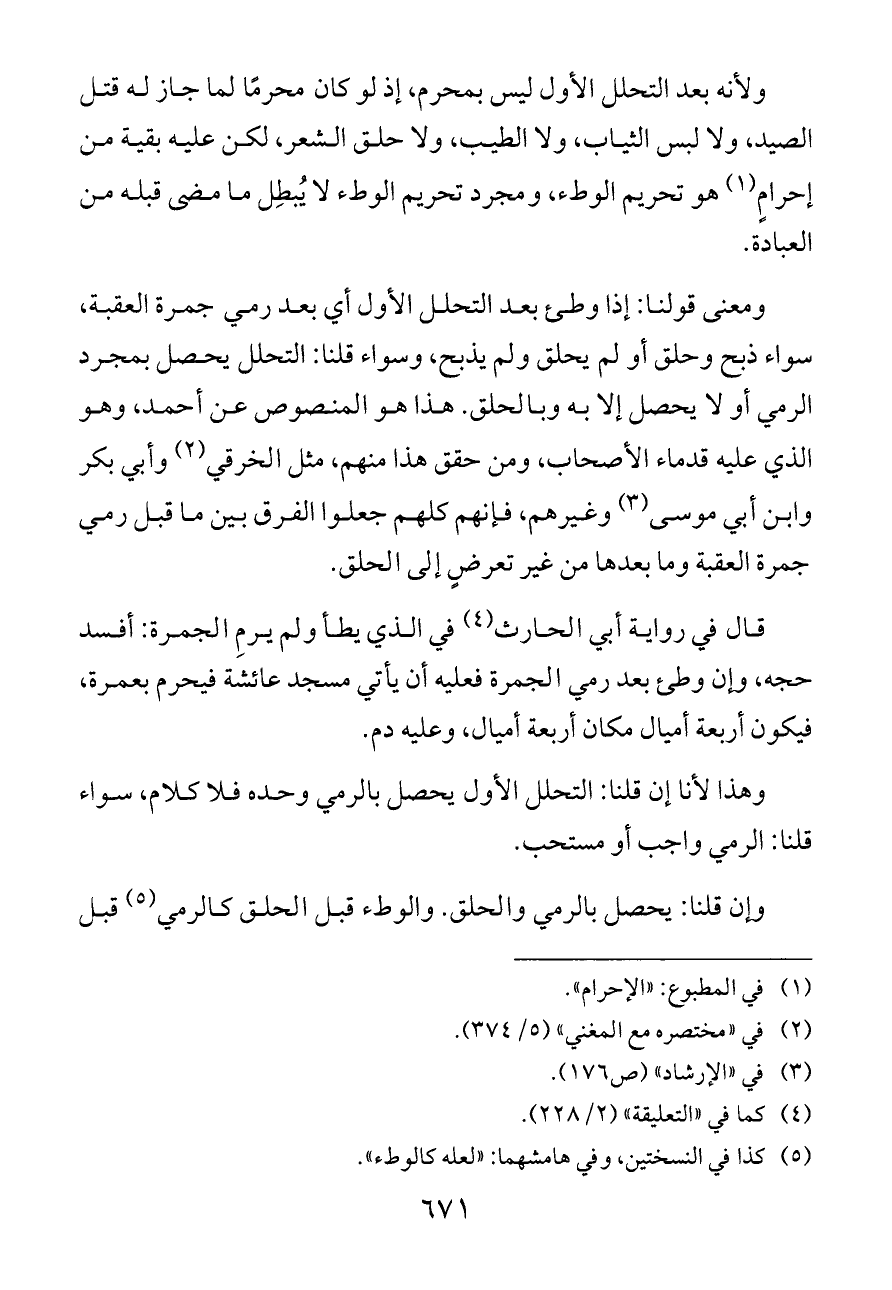 ومعنى قولنا: إذا وطئ بعد التحلل الأول أي بعد رمي جمرة العقبة، سواء ذبح وحلق أو لم يحلق ولم يذبح، وسواء قلنا: التحلل يحصل بمجرد الرمي أو لا يحصل إلا به وبالحلق. هذا هو المنصوص عن أحمد، وهو الذي عليه قدماء الأصحاب، ومن حقق هذا منهم، مثل الخرقي (¬٢) وأبي بكر وابن أبي موسى (¬٣) وغيرهم، فإنهم كلهم جعلوا الفرق بين ما قبل رمي جمرة العقبة وما بعدها من غير تعرضٍ إلى الحلق.
