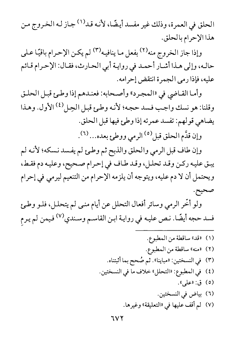 وإذا جاز الخروج منه (¬٢) بفعل ما ينافيه (¬٣) لم يكن الإحرام باقيًا على حاله، وإلى هذا أشار أحمد في رواية أبي الحارث، فقال: الإحرام قائم عليه، فإذا رمى الجمرة انتقض إحرامه.