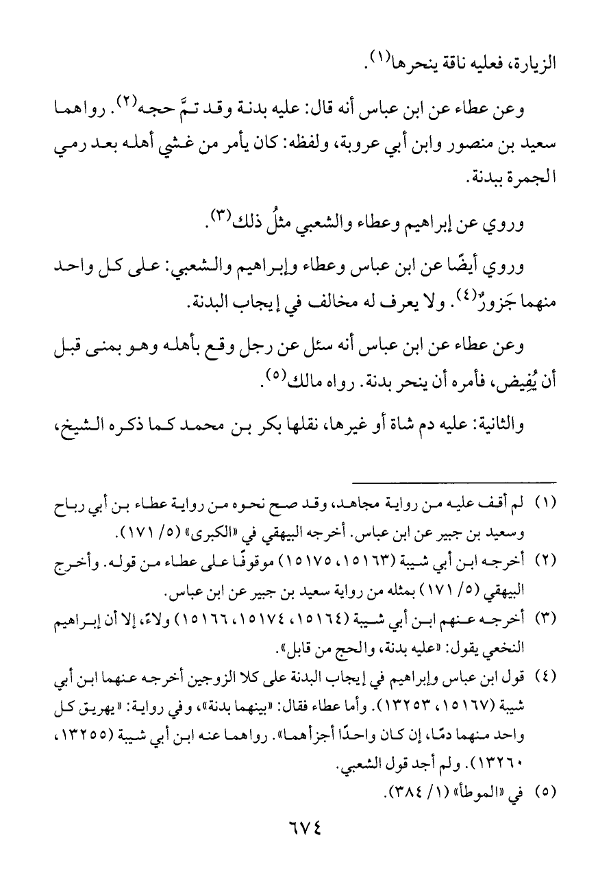 (¬٤) قول ابن عباس وإبراهيم في إيجاب البدنة على كلا الزوجين أخرجه عنهما ابن أبي شيبة (١٥١٦٧، ١٣٢٥٣). وأما عطاء فقال: «بينهما بدنة»، وفي رواية: «يهريق كل واحد منهما دمًا، إن كان واحدًا أجزأهما». رواهما عنه ابن أبي شيبة (١٣٢٥٥، ١٣٢٦٠). ولم أجد قول الشعبي.