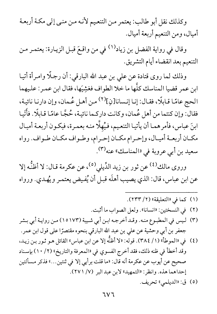 (¬٤) في «الموطأ» (١/ ٣٨٤). قوله: «لا أظنُّه إلا عن ابن عباس» القائل هو ثور بن زيد، وقد أخطأ في ظنه ذلك، فقد أخرج الفسوي في «المعرفة والتاريخ» (٢/ ١٠) بإسناد صحيح عن أيوب عن عكرمة أنه قال: «ما قلت برأيي إلا في ثنتين ... » فذكر مسألتين إحداهما هذه. وانظر: «التمهيد» لابن عبد البر (٧/ ٢٧١).