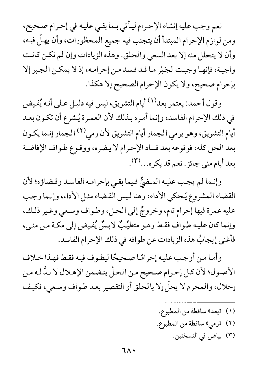 وقول أحمد: يعتمر بعد (¬١) أيام التشريق، ليس فيه دليل على أنه يُفيض في ذلك الإحرام الفاسد، وإنما أمره بذلك لأن العمرة يُشرع أن تكون بعد أيام التشريق، وهو يرمي الجمار أيام التشريق لأن رمي (¬٢) الجمار إنما يكون بعد الحل كله، فوقوعه بعد فساد الإحرام لا يضره، ووقوع طواف الإفاضة بعد أيام منى جائز. نعم قد يكره ... (¬٣).