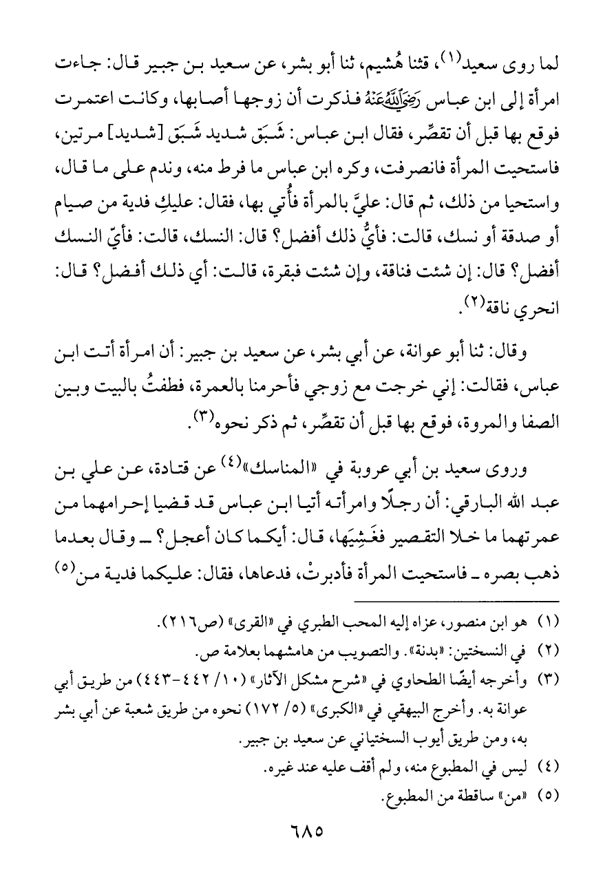 وقال: ثنا أبو عوانة، عن أبي بشر، عن سعيد بن جبير: أن امرأة أتت ابن عباس، فقالت: إني خرجت مع زوجي فأحرمنا بالعمرة، فطفتُ بالبيت وبين الصفا والمروة، فوقع بها قبل أن تقصِّر، ثم ذكر نحوه (¬٣).