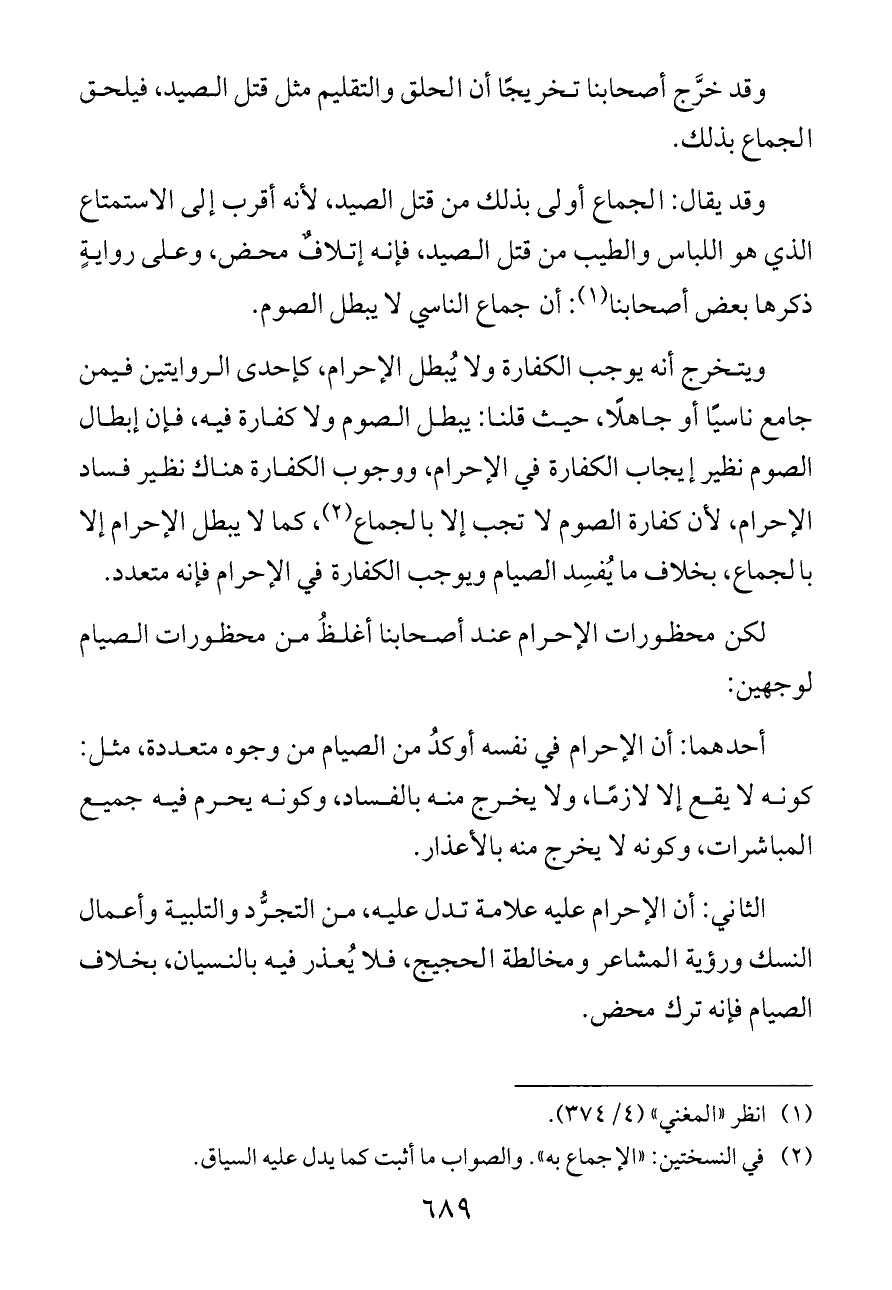 ويتخرج أنه يوجب الكفارة ولا يُبطل الإحرام، كإحدى الروايتين فيمن جامع ناسيًا أو جاهلًا، حيث قلنا: يبطل الصوم ولا كفارة فيه، فإن إبطال الصوم نظير إيجاب الكفارة في الإحرام، ووجوب الكفارة هناك نظير فساد الإحرام، لأن كفارة الصوم لا تجب إلا بالجماع (¬٢)، كما لا يبطل الإحرام إلا بالجماع، بخلاف ما يُفسِد الصيام ويوجب الكفارة في الإحرام فإنه متعدد.