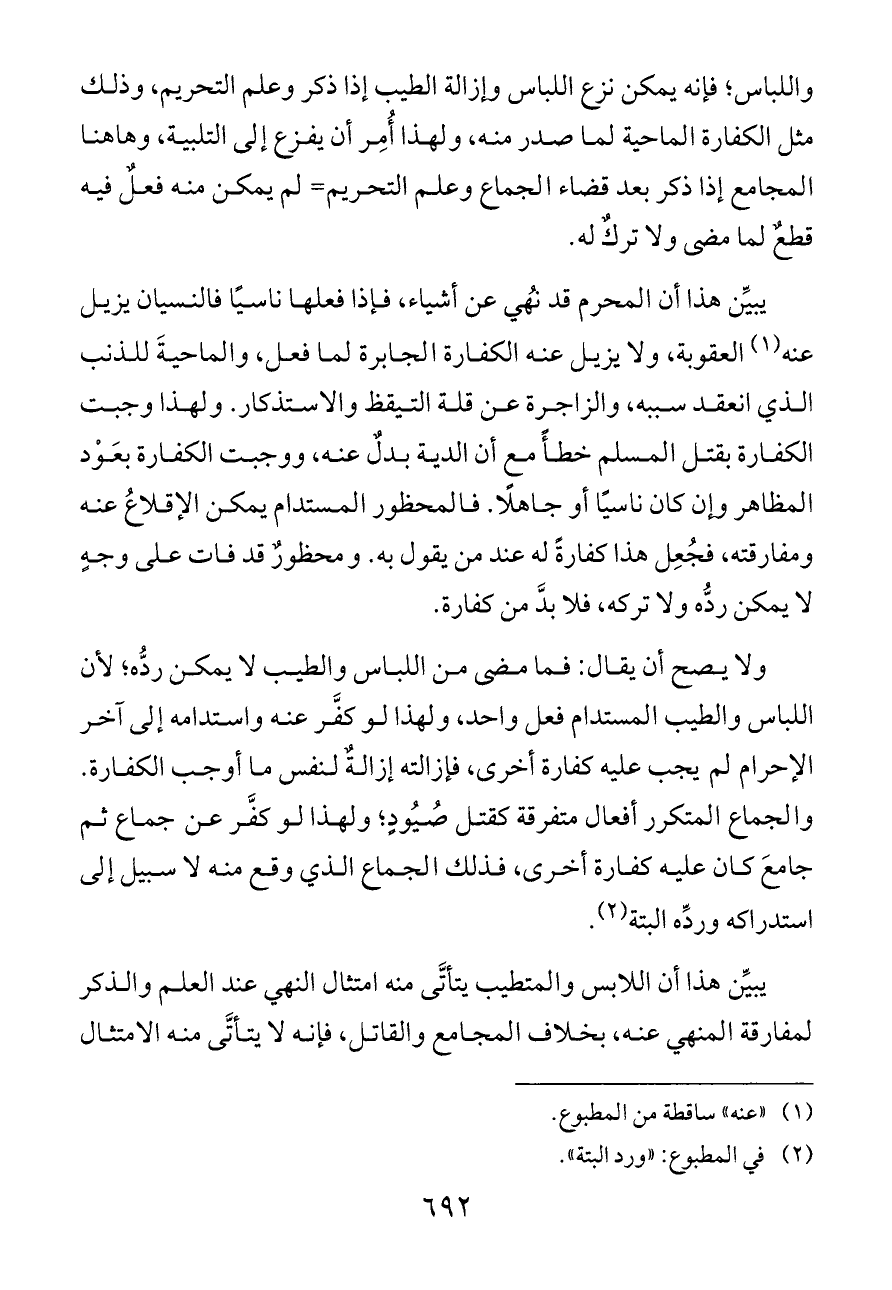 ولا يصح أن يقال: فما مضى من اللباس والطيب لا يمكن ردُّه؛ لأن اللباس والطيب المستدام فعل واحد، ولهذا لو كفَّر عنه واستدامه إلى آخر الإحرام لم يجب عليه كفارة أخرى، فإزالته إزالةٌ لنفس ما أوجب الكفارة. والجماع المتكرر أفعال متفرقة كقتل صُيُودٍ؛ ولهذا لو كفَّر عن جماع ثم جامعَ كان عليه كفارة أخرى، فذلك الجماع الذي وقع منه لا سبيل إلى استدراكه وردِّه البتة (¬٢).