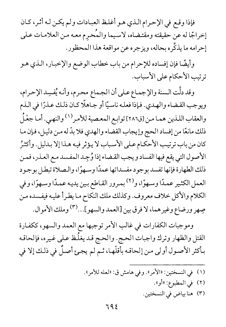 وقد دلَّت السنة والإجماع على أن الجماع محرم، وأنه يُفسِد الإحرام، ويوجب القضاء والهدي. فإذا فعله ناسيًا أو جاهلًا كان ذلك عذرًا في الذم والعقاب اللذين هما من [ق ٢٨٦] توابع المعصية للأمر (¬١) والنهي. أما جعْلُ ذلك مانعًا من إفساد الحج وإيجاب القضاء والهدي فلا بدّ له من دليل، فإن ما كان من باب ترتيب الأحكام على الأسباب لا يؤثر فيه هذا إلا بدليل. وأكثرُ الأصول التي يقع فيها الفساد ويجب القضاء إذا وُجِد المفسد مع العذر، فمن ذلك الطهارة فإنها تفسد بوجود مفسداتها عمدًا وسهوًا، والصلاة تبطل بوجود العمل الكثير عمدًا وسهوًا، و (¬٢) بمرور القاطع بين يديه عمدًا وسهوًا، وفي الكلام والأكل خلاف معروف. وكذلك ملك النكاح ما يطرأ عليه فيفسده من صِهر ورضاع وغيرهما، لا فرق بين [العمد والسهو] ... (¬٣) وملك الأموال.