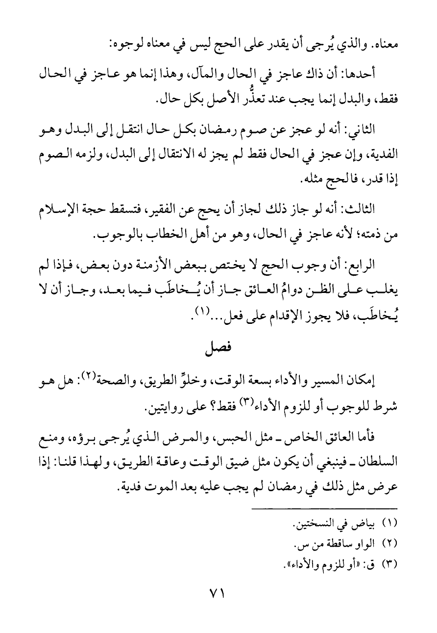 إمكان المسير والأداء بسعة الوقت، وخلوِّ الطريق، والصحة (¬٢): هل هو شرط للوجوب أو للزوم الأداء (¬٣) فقط؟ على روايتين.