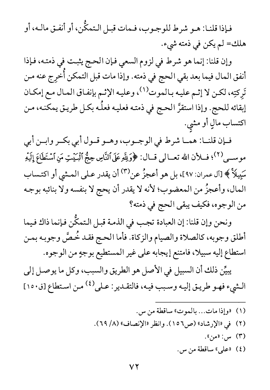 ونحن وإن قلنا: إن العبادة تجب في الذمة قبل التمكُّن فإنما ذاك فيما أطلق وجوبه، كالصلاة والصيام والزكاة. فأما الحج فقد خُصَّ وجوبه بمن استطاع إليه سبيلا، فامتنع إيجابه على غير المستطيع بوجهٍ من الوجوه.