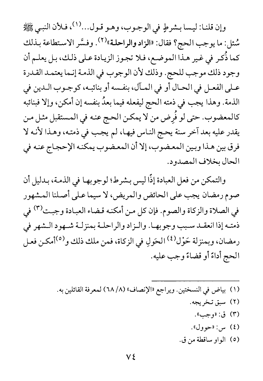 وإن قلنا: ليسا بشرطٍ في الوجوب، وهو قول ... (¬١)، فلأن النبي - صلى الله عليه وسلم - سُئل: ما يوجب الحج؟ فقال: «الزاد والراحلة» (¬٢). وفسَّر الاستطاعة بذلك كما ذُكر في غير هذا الموضع، فلا تجوز الزيادة على ذلك، بل يعلم أن وجود ذلك موجب للحج. وذلك لأن الوجوب في الذمة إنما يعتمد القدرة على الفعل في الحال أو في المآل، بنفسه أو بنائبه، كوجوب الدين في الذمة. وهذا يجب في ذمته الحج ليفعله فيما بعدُ بنفسه إن أمكن، وإلا فبنائبه كالمعضوب. حتى لو فُرِض من لا يمكن الحج عنه في المستقبل مثل من يقدر عليه بعد آخر سنة يحج الناس فيها، لم يجب في ذمته، وهذا لأنه لا فرق بين هذا وبين المعضوب، إلا أن المعضوب يمكنه الإحجاج عنه في الحال بخلاف المصدود.