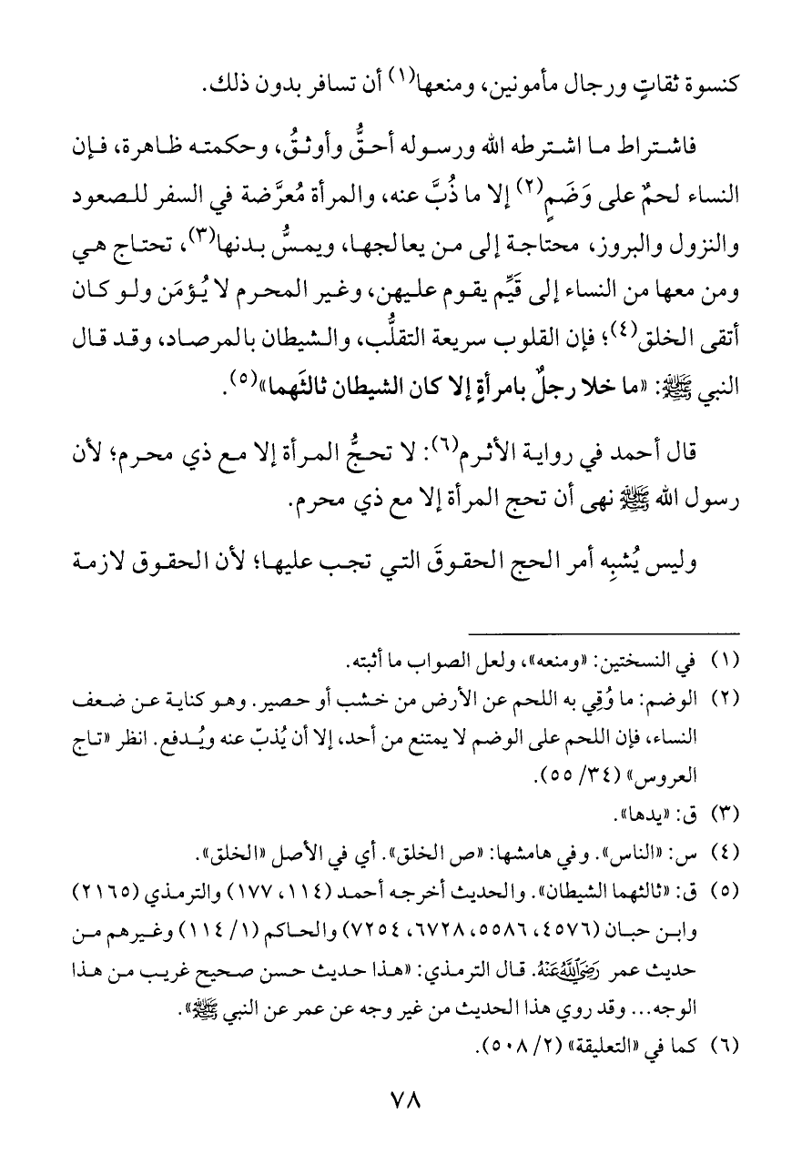 فاشتراط ما اشترطه الله ورسوله أحقُّ وأوثقُ، وحكمته ظاهرة، فإن النساء لحمٌ على وَضَمٍ (¬٢) إلا ما ذُبَّ عنه، والمرأة مُعرَّضة في السفر للصعود والنزول والبروز، محتاجة إلى من يعالجها، ويمسُّ بدنها (¬٣)، تحتاج هي ومن معها من النساء إلى قَيِّم يقوم عليهن، وغير المحرم لا يُؤمَن ولو كان أتقى الخلق (¬٤)؛ فإن القلوب سريعة التقلُّب، والشيطان بالمرصاد، وقد قال النبي - صلى الله عليه وسلم -: «ما خلا رجلٌ بامرأةٍ إلا كان الشيطان ثالثَهما» (¬٥).