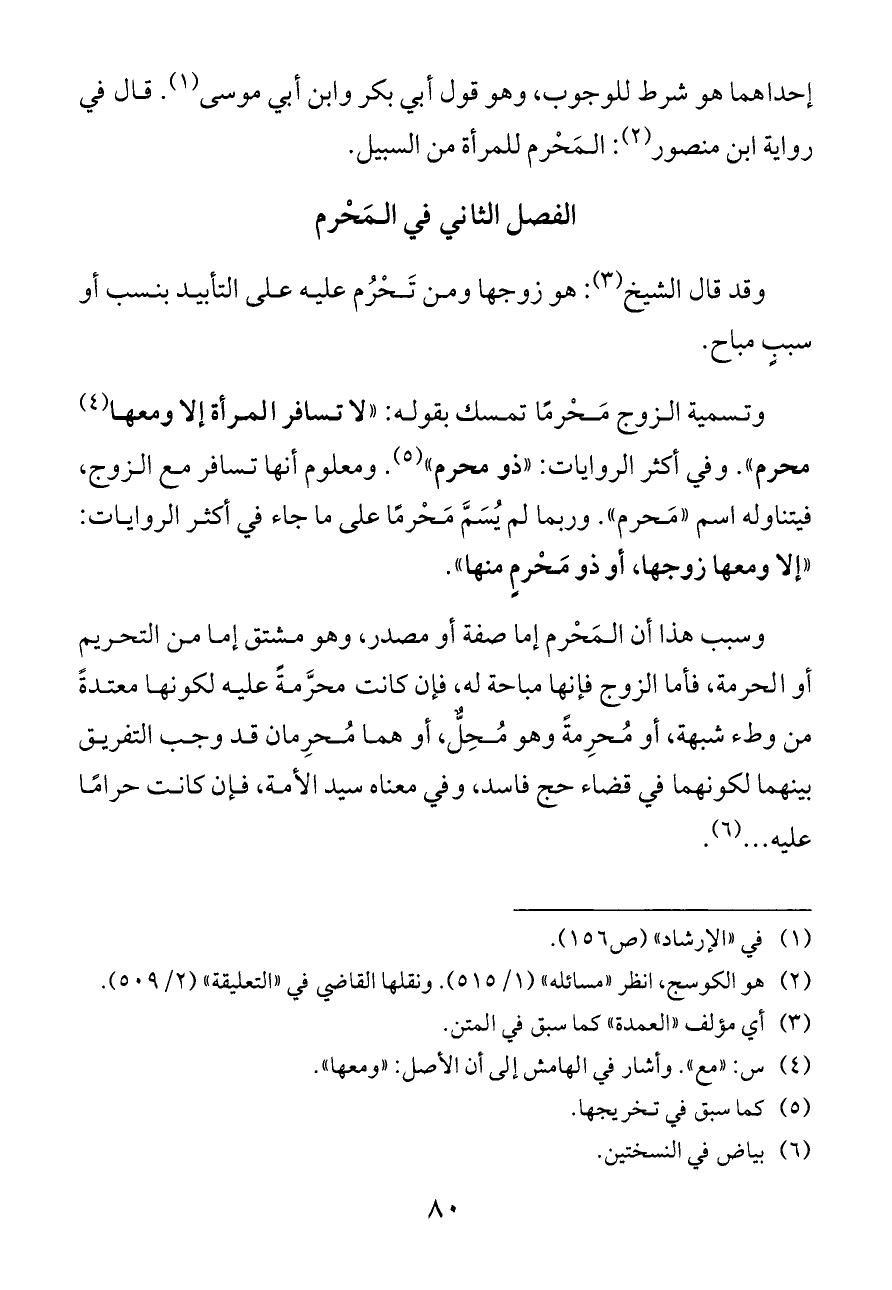 وتسمية الزوج مَحْرمًا تمسك بقوله: «لا تسافر المرأة إلا ومعها (¬٤) محرم». وفي أكثر الروايات: «ذو محرم» (¬٥). ومعلوم أنها تسافر مع الزوج، فيتناوله اسم «مَحرم». وربما لم يُسَمَّ مَحْرمًا على ما جاء في أكثر الروايات: «إلا ومعها زوجها، أو ذو مَحْرمٍ منها».