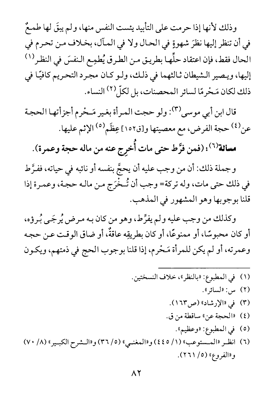 (¬٦) انظر «المستوعب» (١/ ٤٤٥) و «المغني» (٥/ ٣٦) و «الشرح الكبير» (٨/ ٧٠) و «الفروع» (٥/ ٢٦١).