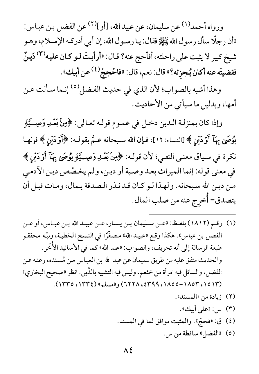 والحديث متفق عليه من طريق سليمان عن عبد الله بن العباس من مُسنده، وعنه عن الفضل، والسائل فيه امرأة من خثعم، وليس فيه التشبيه بالدَّين. انظر «صحيح البخاري» (١٥١٣، ١٨٥٣ - ١٨٥٥، ٤٣٩٩، ٦٢٢٨) و «مسلم» (١٣٣٤، ١٣٣٥).