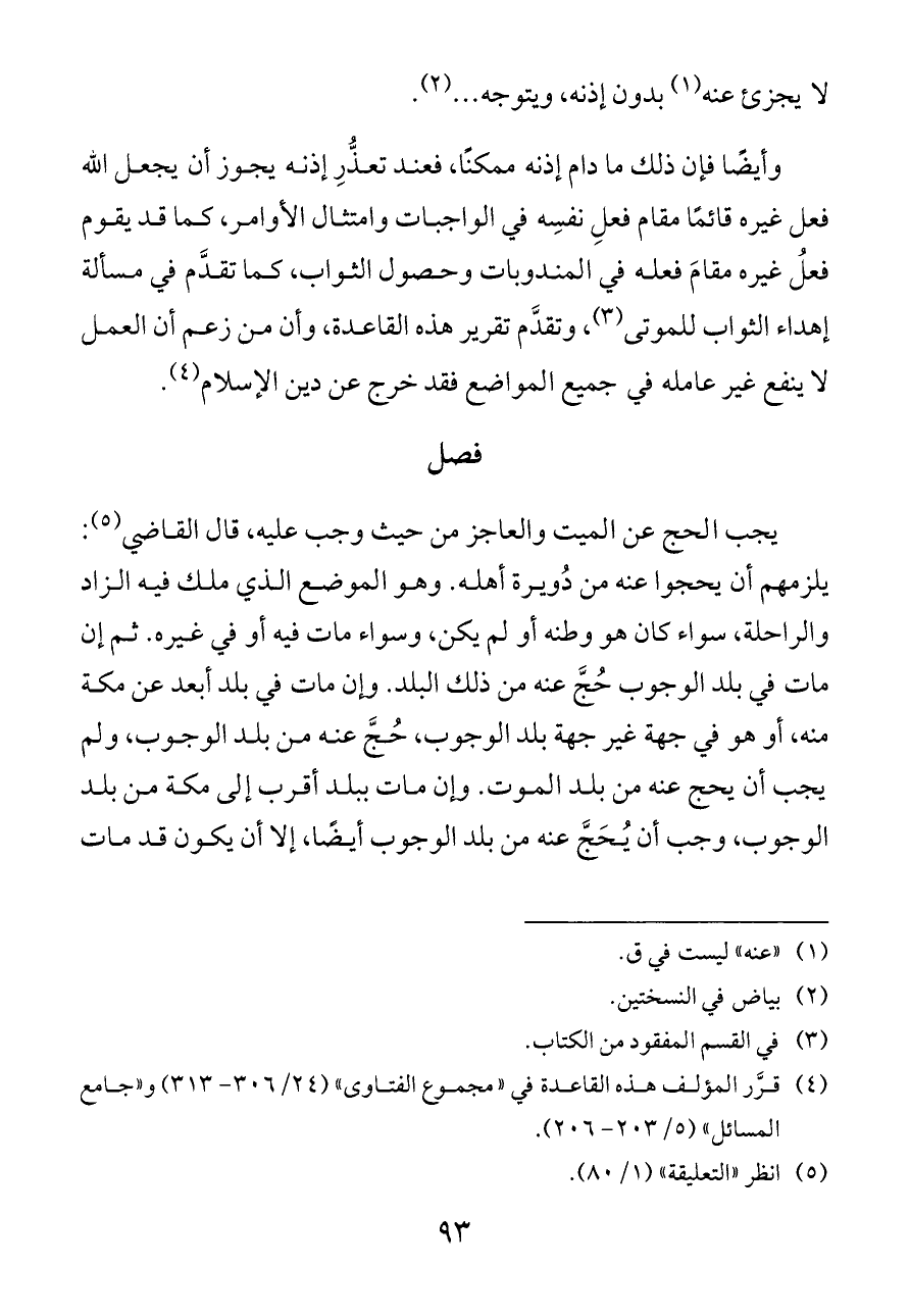 وأيضًا فإن ذلك ما دام إذنه ممكنًا، فعند تعذُّرِ إذنه يجوز أن يجعل الله فعل غيره قائمًا مقام فعلِ نفسِه في الواجبات وامتثال الأوامر، كما قد يقوم فعلُ غيره مقامَ فعله في المندوبات وحصول الثواب، كما تقدَّم في مسألة إهداء الثواب للموتى (¬٣)، وتقدَّم تقرير هذه القاعدة، وأن من زعم أن العمل لا ينفع غير عامله في جميع المواضع فقد خرج عن دين الإسلام (¬٤).
