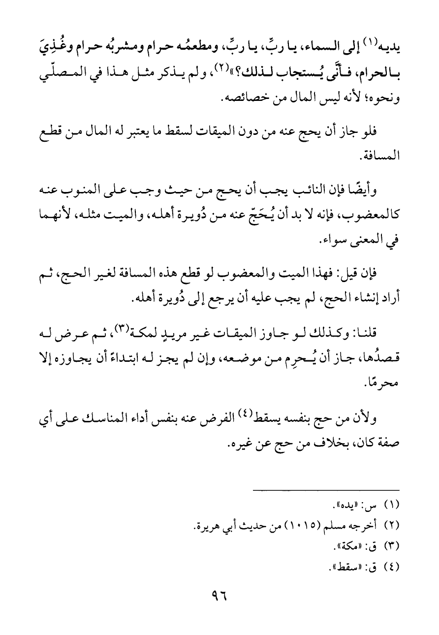 يديه (¬١) إلى السماء، يا ربِّ، يا ربِّ، ومطعمُه حرام ومشربُه حرام وغُذِيَ بالحرام، فأنَّى يُستجاب لذلك؟» (¬٢)، ولم يذكر مثل هذا في المصلّي ونحوه؛ لأنه ليس المال من خصائصه.