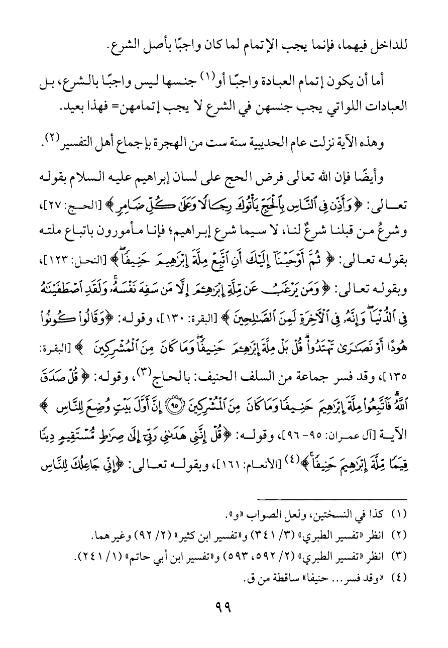 وأيضًا فإن الله تعالى فرض الحج على لسان إبراهيم عليه السلام بقوله تعالى: {وَأَذِّنْ فِي النَّاسِ بِالْحَجِّ يَأْتُوكَ رِجَالًا وَعَلَى كُلِّ ضَامِرٍ} [الحج: ٢٧]، وشرعُ من قبلنا شرعٌ لنا، لا سيما شرع إبراهيم؛ فإنا مأمورون باتباع ملته بقوله تعالى: {ثُمَّ أَوْحَيْنَا إِلَيْكَ أَنِ اتَّبِعْ مِلَّةَ إِبْرَاهِيمَ حَنِيفًا} [النحل: ١٢٣]، وبقوله تعالى: {وَمَنْ يَرْغَبُ عَنْ مِلَّةِ إِبْرَاهِيمَ إِلَّا مَنْ سَفِهَ نَفْسَهُ وَلَقَدِ اصْطَفَيْنَاهُ فِي الدُّنْيَا وَإِنَّهُ فِي الْآخِرَةِ لَمِنَ الصَّالِحِينَ} [البقرة: ١٣٠]، وقوله: {وَقَالُوا كُونُوا هُودًا أَوْ نَصَارَى تَهْتَدُوا قُلْ بَلْ مِلَّةَ إِبْرَاهِيمَ حَنِيفًا وَمَا كَانَ مِنَ الْمُشْرِكِينَ} [البقرة: ١٣٥]، وقد فسر جماعة من السلف الحنيف: بالحاج (¬٣)، وقوله: {قُلْ صَدَقَ اللَّهُ فَاتَّبِعُوا مِلَّةَ إِبْرَاهِيمَ حَنِيفًا وَمَا كَانَ مِنَ الْمُشْرِكِينَ (٩٥) إِنَّ أَوَّلَ بَيْتٍ وُضِعَ لِلنَّاسِ} الآية [آل عمران: ٩٥ - ٩٦]، وقوله: {قُلْ إِنَّنِي هَدَانِي رَبِّي إِلَى صِرَاطٍ مُسْتَقِيمٍ دِينًا قِيَمًا مِلَّةَ إِبْرَاهِيمَ حَنِيفًا} (¬٤)