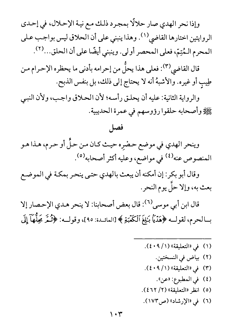 قال ابن أبي موسى (¬٦): قال بعض أصحابنا: لا ينحر هدي الإحصار إلا بالحرم، لقوله {هَدْيًا بَالِغَ الْكَعْبَةِ} [المائدة: ٩٥]، وقوله: {ثُمَّ مَحِلُّهَا إِلَى