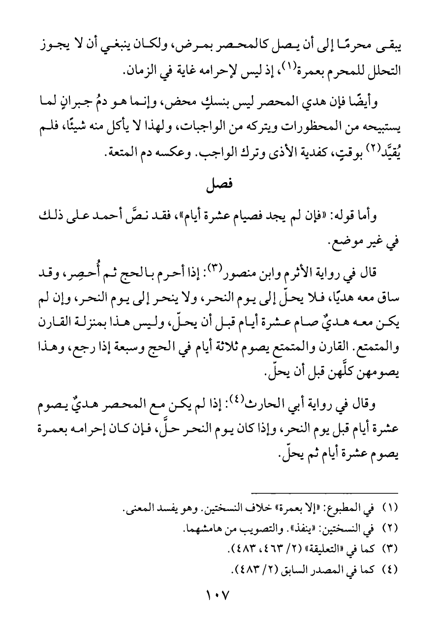 وقال في رواية أبي الحارث (¬٤): إذا لم يكن مع المحصر هديٌ يصوم عشرة أيام قبل يوم النحر، وإذا كان يوم النحر حلَّ، فإن كان إحرامه بعمرة يصوم عشرة أيام ثم يحلّ.