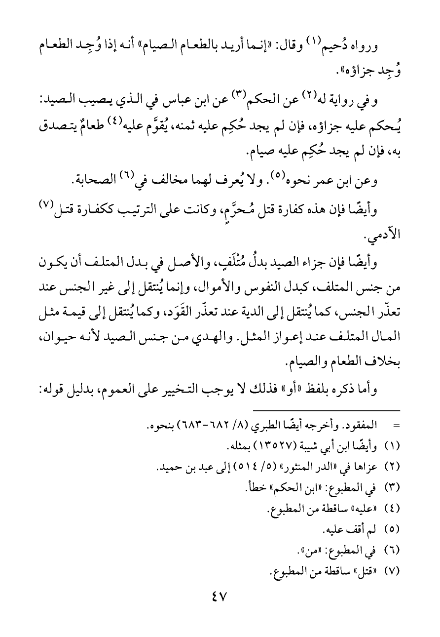 وفي رواية له (¬٢) عن الحكم (¬٣) عن ابن عباس في الذي يصيب الصيد: يُحكم عليه جزاؤه، فإن لم يجد حُكِم عليه ثمنه، يُقوَّم عليه (¬٤) طعامٌ يتصدق به، فإن لم يجد حُكِم عليه صيام.